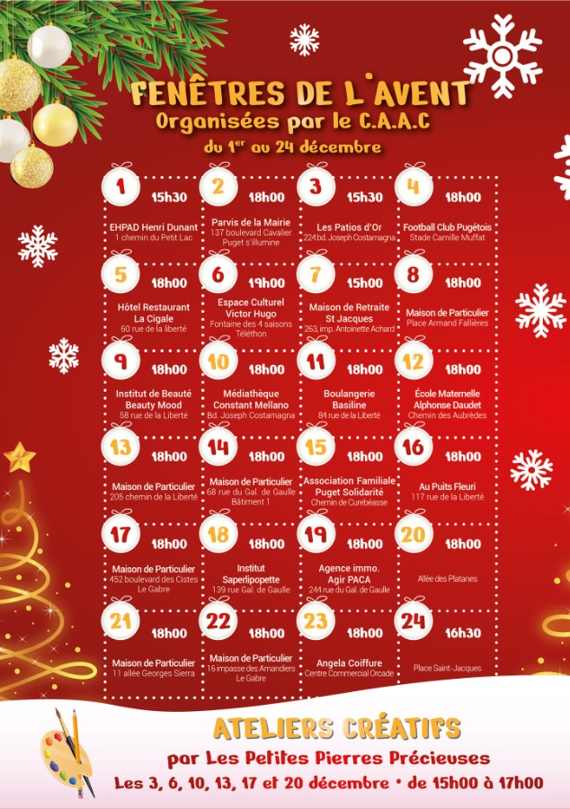 16h30: Marché de Noël et manèges 17h45: Fenêtre de l'Avent par le C.A.A.C. (Les fenêtres ont lieu du 1er au 24 décembre)