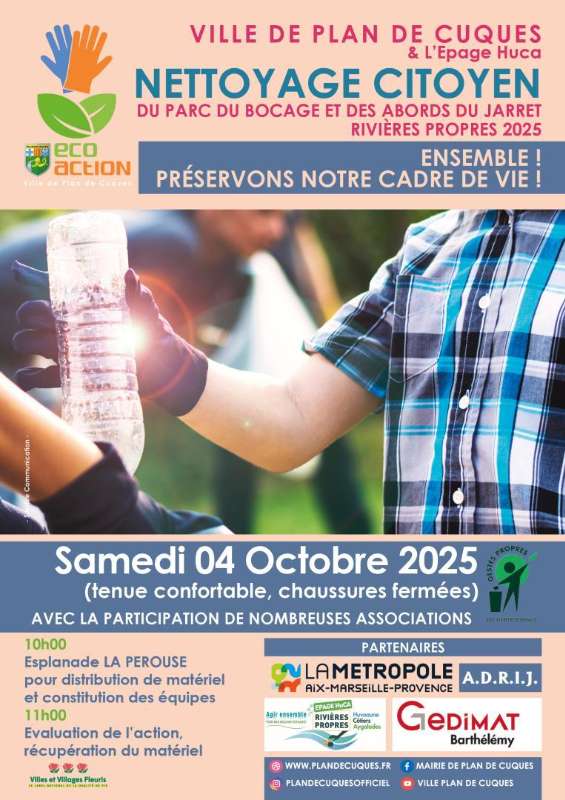 En partenariat avec l’Association des Riverains du Jarret, Aix-Marseille-Provence Métropole, l’ EPAGE HUCA Huveaune Côtiers Aygalades, et de très nombreuses associations de Plan-De-Cuques, cette opération citoyenne ouverte à tous est un geste collectif pour préserver notre patrimoine naturel.