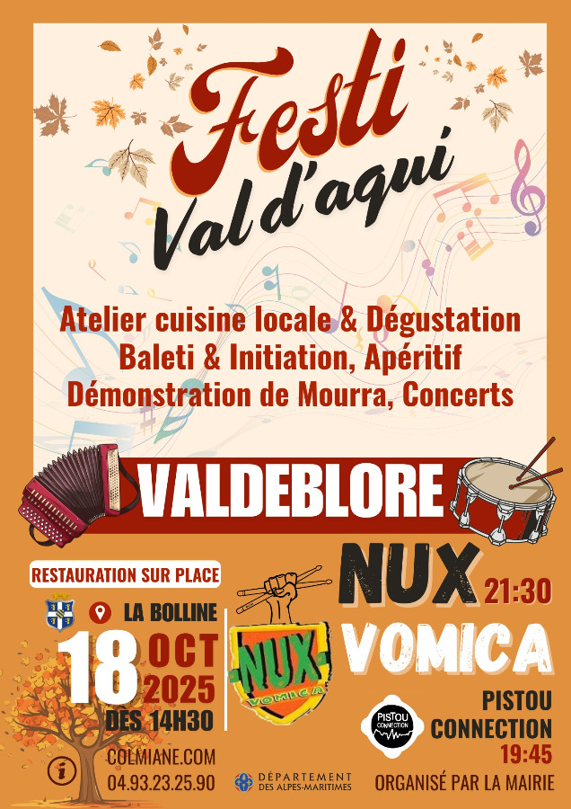 Festi « Val » d’Aqui 14h30, Atelier de cuisine locale, partage de connaissance entre génération, 16h, Baleti initiation danses traditionnelles animée par Corinne Girodan de l’association Passerelle, suivis d’une dégustation de plats et d’un apéro chanté. 19h45, 1er concert avec Pistou Connection, suivi à 21h30 de Nux Vomica, fin de soirée animée par le DJ de Nux Vomica.