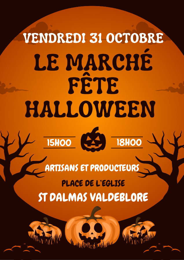 Marché Halloween de 15h à 18h, marché artisanal et alimentaire spécial Halloween, artisans et producteurs déguisés, distribution de bonbons dans une ambiance musicale.