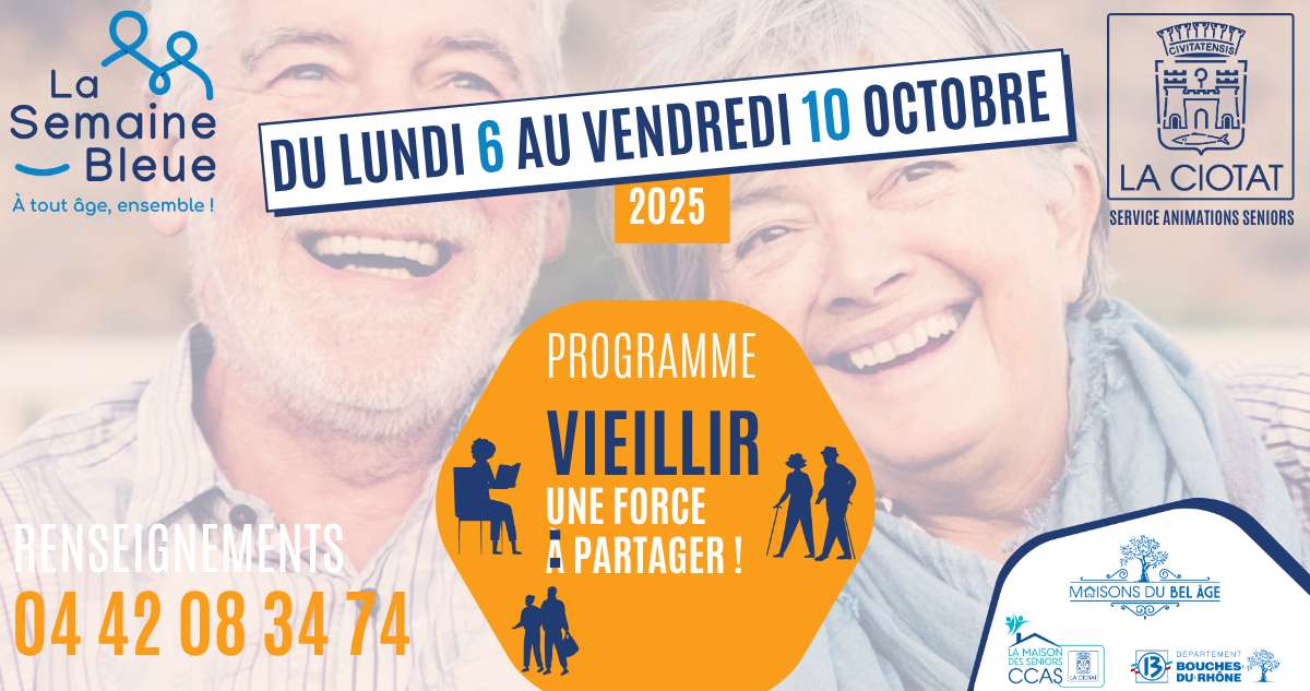 Du 6 au 10 octobre 2025, La Ciotat s’habille aux couleurs de la Semaine Bleue, ce temps fort annuel dédié à la solidarité intergénérationnelle. Ateliers, spectacles, rencontres et animations culturelles installés au cœur des quartiers et des lieux de vie pour célébrer le lien social et valoriser le rôle des seniors dans la cité.