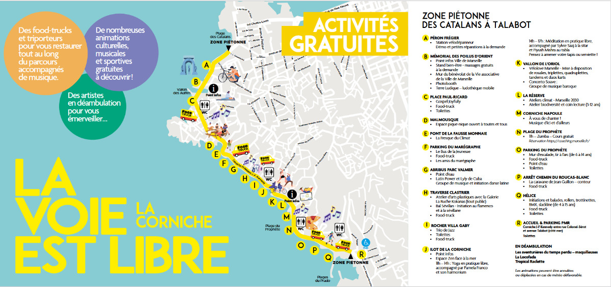 Depuis 2021, la Ville de Marseille offre régulièrement à ses habitants un rendez-vous devenu incontournable : La Voie est Libre. Une journée durant laquelle la célèbre Corniche Kennedy, de la plage des Catalans au parc Talabot / Marina Olympique est interdite aux voitures pour se transformer en promenade festive, culturelle et sportive, ouverte uniquement aux piétons, vélos et trottinettes.