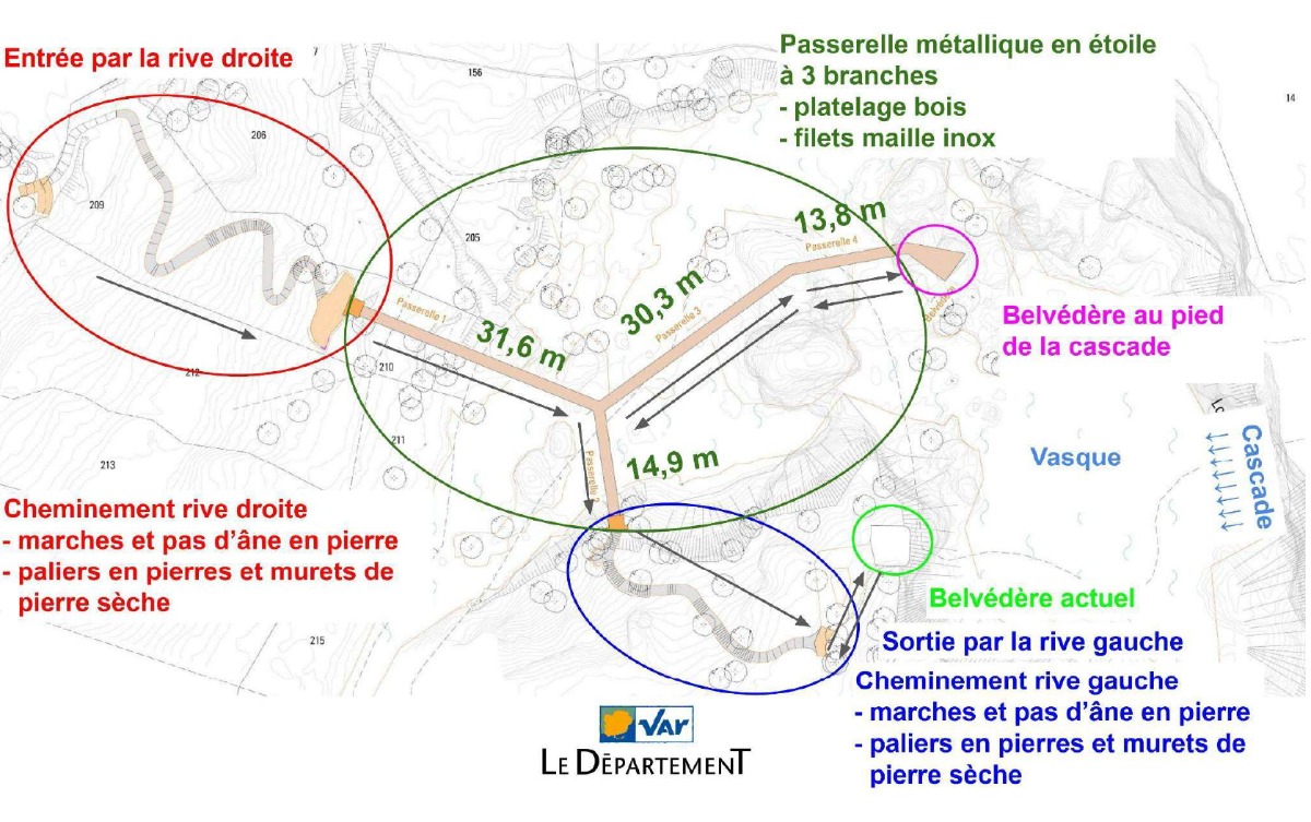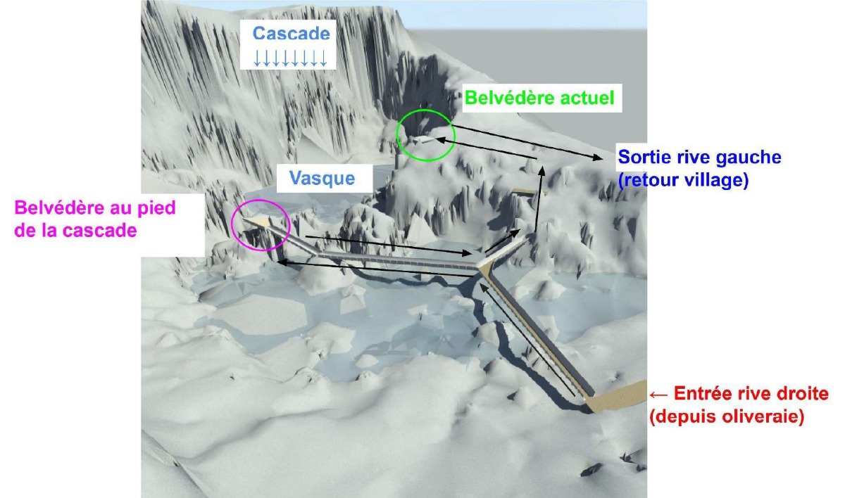 Ces nouvelles installations vont également permettre de créer un parcours de visite organisé, à sens unique : Désormais, les visiteurs seront invités à arriver depuis la rive droite, via l’oliveraie, pour descendre au site de la cascade. « Après avoir admiré la chute d’eau depuis ce nouveau belvédère, les visiteurs pourront rejoindre la rive gauche, remonter via un nouveau cheminement en pierre et déboucher à proximité du belvédère existant pour une vue imprenable du haut de la cascade, avant de regagner le village. » précise l’institution.