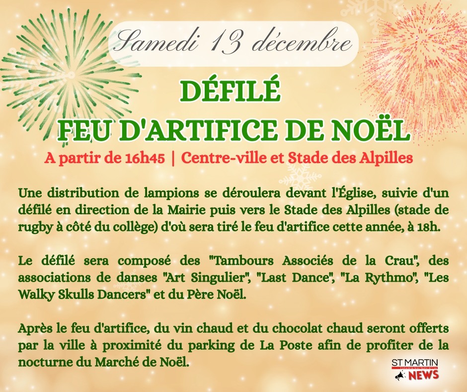 Le cortège, mené par les Tambours Associés de la Crau, repartira ensuite vers le stade des Alpilles, où sera tiré le feu d'artifice à 18h (report le dimanche si mauvais temps).