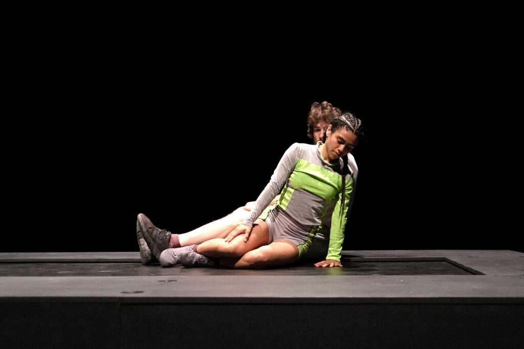 Symbole d’un monde agité et en perpétuel mouvement, un tapis roulant devient le terrain de jeu d’un dialogue à mains nues. C’est sur cette scène inédite et mouvante que les deux artistes enchaînent portés et acrobaties et se jouent malicieusement de la gravité.