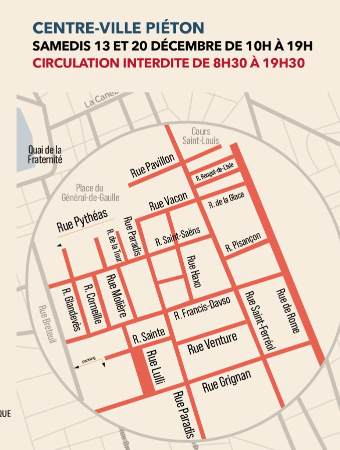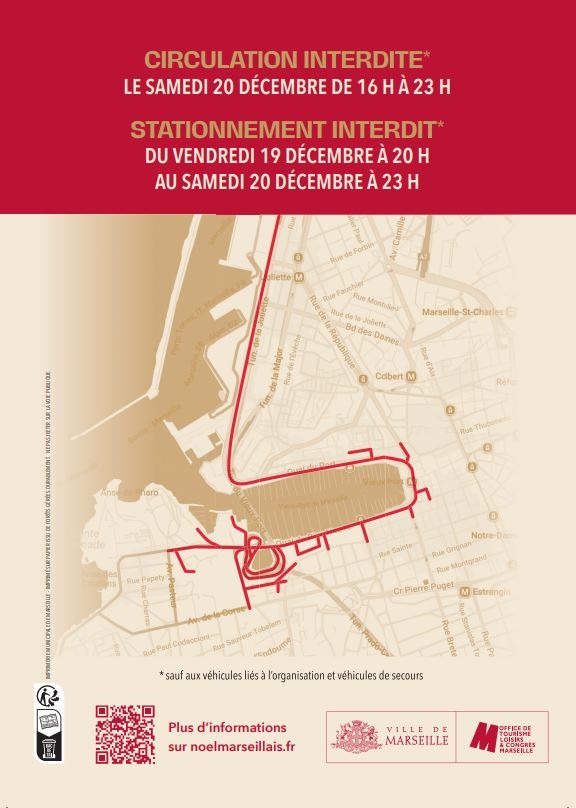 Dès 16 heures tout le secteur autour du Vieux Port sera piétonnisé, et notamment les sorties des tunnels vers le Vieux Port et le Pharo. Les automobilistes devront continuer tout droit soit vers la Joliette, soit vers Prado Carénage (payant). A ceci, s'ajoute la piétonnisation de l'hyper centre dans le cadre de la braderie de Noël.