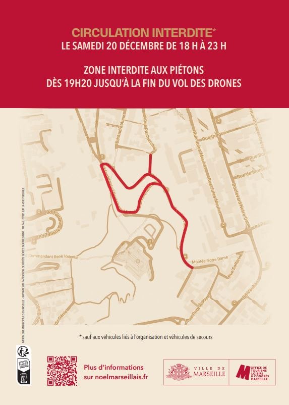 Même scénario concernant les abords de Notre Dame de la Garde. Afin de permettre le décollage des drones en toute sécurité, les accès seront interdits aux voitures dès 18h puis aux piétons aux alentours de 19h.