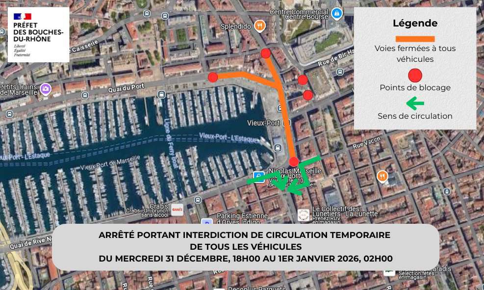 C'est une première cette année : en "raison d'un afflux important de population attendu sur le Vieux-Port" de Marseille, il sera en partie piétonnisé dès mercredi 31 décembre à 18h. C'est le fond du Vieux-Port, c'est à dire le quai des Belges / quai de la Fraternité qui sera interdit à la circulation. Elle restera possible, comme à l'habitude, sur le quai de Rive Neuve et en sens unique sur le quai du Port côté mairie.
