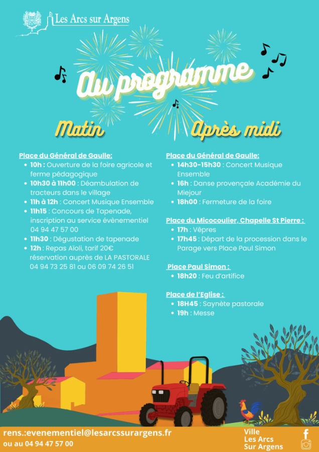 Une fête traditionnelle sur notre commune, la Fête de Saint Sébastien. Elleanime notre place avec les animaux, les tracteurs anciens et les nombreux stands des commerçants avec leurs produits locaux. Cette foire agricole et provençale est l’événement traditionnel institué par nos anciens pour la St Sébastien. Les ruelles du parage s'animent lors du passage de la procession de Saint Sébastien, saint patron de notre commune. Tout un programme : Marché artisanal, déambulation de tracteurs, ferme pédagogique, exposition de véhicules agircoles, danse et chants provençaux, aioli, vêpres à la chapelle Saint-Pierre, procession, messe et feu d’artifice !