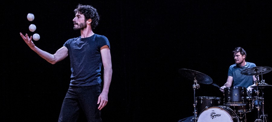 L'un jongle, l'autre joue de la batterie. Ensemble, ils composent un spectacle à la frontière du cirque, de la musique et de la danse pour faire jaillir sous nos yeux l'énergie d'une relation humaine.