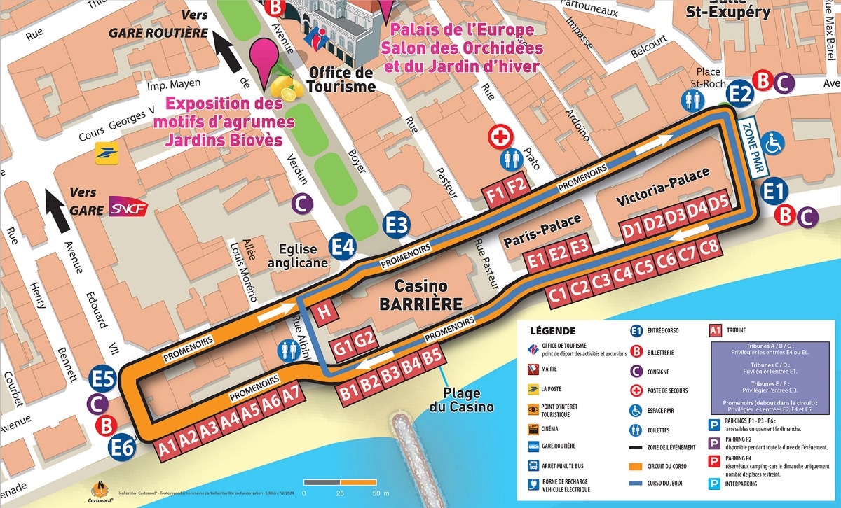 La Ville de Menton recommande d'arriver avant 11h pour les corso du dimanche et 18h, pour les corsos nocturnes du jeudi. Aucune entrée ne sera possible 15 minutes après le début du corso.