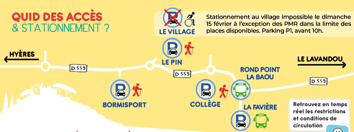 Stationnement : Le stationnement au village est impossible le dimanche, à l'exception des places pour personnes à mobilité réduite. Des parkings gratuits sont disponibles avec des sentiers pédestres fléchés pour guider les visiteurs.