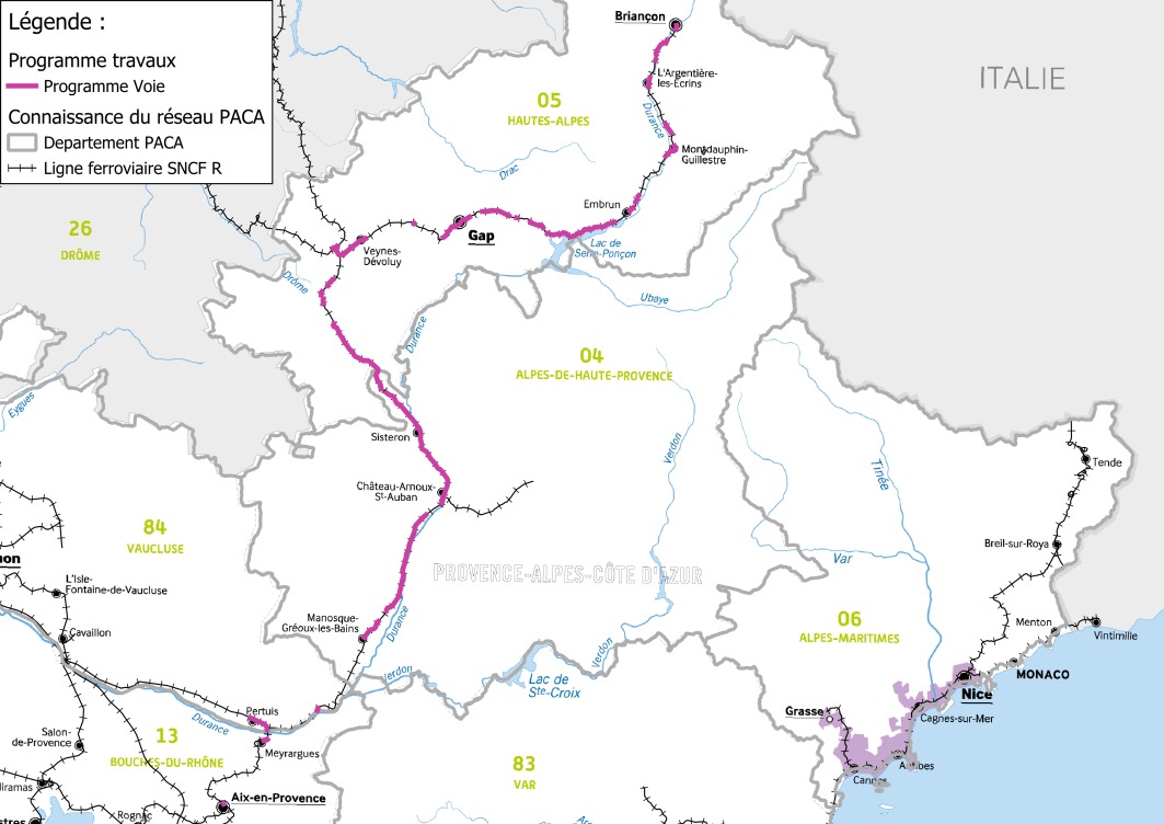 - Renouvellement de 100 km de voie, principalement entre Manosque et Briançon (remplacement du ballast, traverses, rails…)