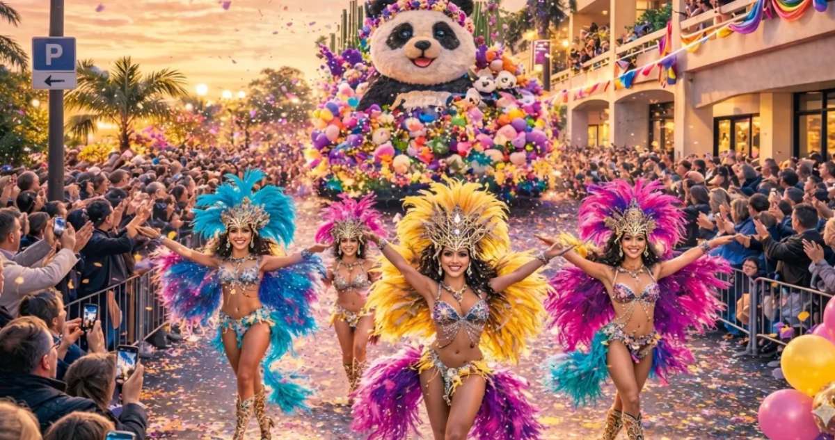Le cœur de la soirée, c'est lui : le grand défilé haut en couleurs qui envahit la Place du Pin dans un tourbillon de costumes, de musique et de bonne humeur. Chars spectaculaires, mascottes — dont le désormais iconique Panda du Carnaval du Pin —, danseurs et artistes se succèdent dans une ambiance électrique, sous une pluie de millions de confettis qui finissent toujours par atterrir partout, y compris dans les cheveux.