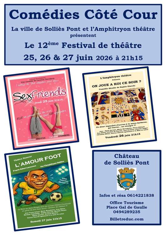 La ville de Solliès-Pont et l'Amphitryon théâtre vous présentent le 12ème festival des Comédies Côté Cour du 25 au 27 juin.