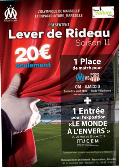 Découvrir le Mucem et assister au match OM – Ajaccio qui aura lieu le 5 avril au Vélodrome, voilà ce que vous propose ce Lever de rideau. Un billet couplé qui vous permet de réaliser deux sorties que tout pourrait opposer ! Voilà l'occasion de découvrir les nouvelles expositions temporaires du Mucem, «Le monde à l’envers, carnavals et mascarades d’Europe et de Méditerranée» et "Splendeurs de Volubilis".