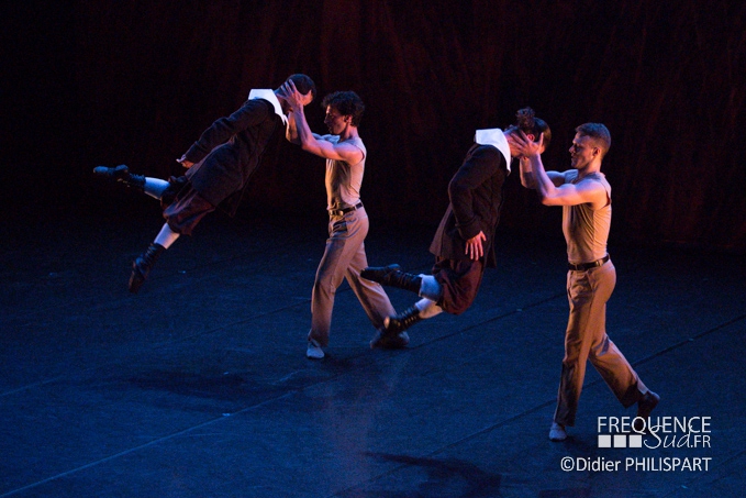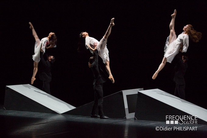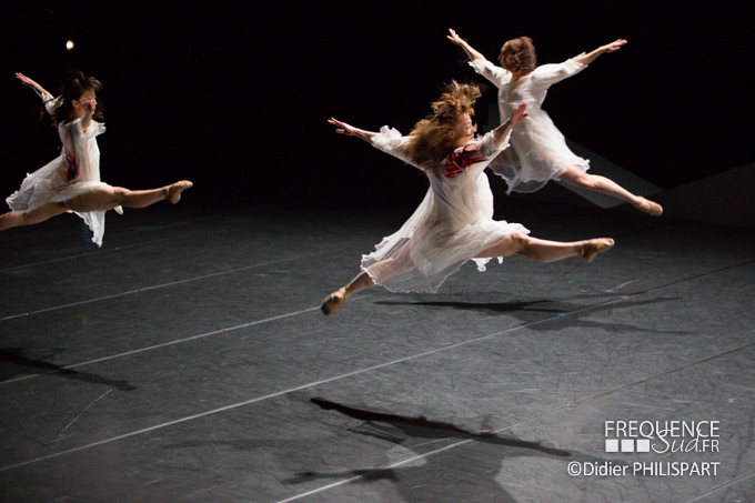 Quatre danseuses aériennes et légères, vêtues de robes blanches maculées de sang, évoluent en opposition face à quatre danseurs vêtus de noirs.
