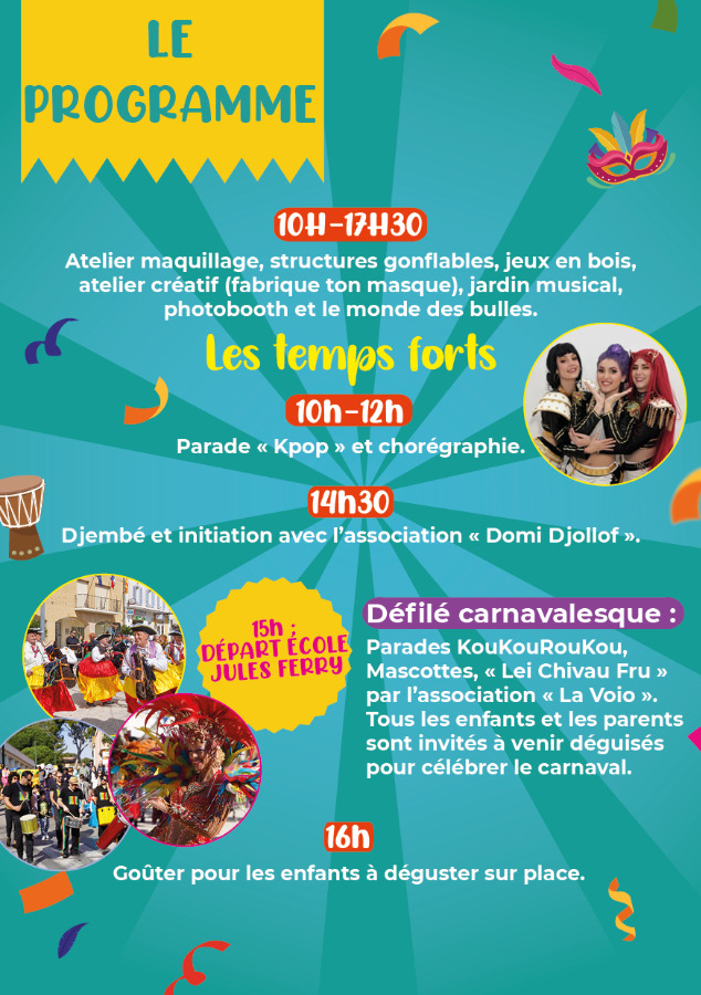 • 15h : Défilé carnavalesque au départ de l’école Jules Ferry accompagné des parades KouKouRouKou, Mascottes et « Lei Chivau Fru » par l’association La Voio. Tous les enfants et les parents sont invités à venir déguisés.