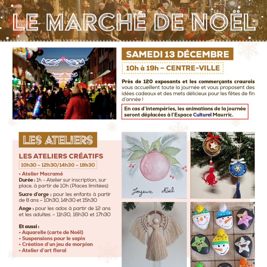 Plus d’une centaine d’exposants et les commerçants craurois vous accueillent toute la journée et vous proposent des idées cadeaux et des mets délicieux pour les fêtes de fin d’année !