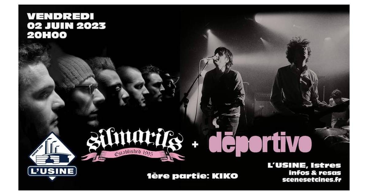 Le premier groupe, Déportivo est influencé par un rock anglo-saxon à la croisée entre Nirvana à Oasis. Le second, Silmarils donne dans la fusion rock/hip-hop s'inspirant autant des Clash que de Rage Against The Machine. "Il va y avoir du sport à L'Usine" avec 3 concerts (Kiko, groupe local en 1ère partie) pour le prix d'un !