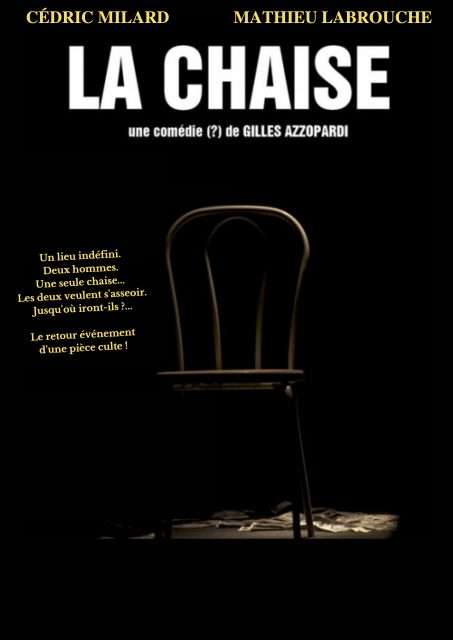 Un orage gronde. Deux hommes que tout oppose se réfugient dans un lieu indéfini... Rien, à part une chaise... Les deux veulent s'asseoir. Huis clos hilarant, puis bouleversant. Un texte colossal, qui interpelle et interroge sur la valeur des choses et de vies..