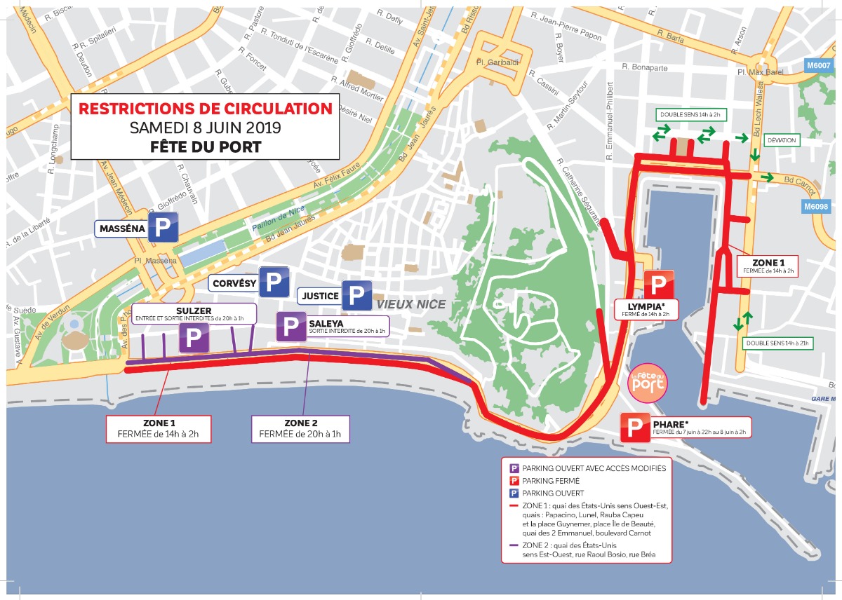 Quai des États-Unis sens Ouest-Est, quais: Papacino, Lunel, Rauba Capeu et la place Guynemer, place Île de Beauté, quai des 2 Emmanuel, boulevard Carnot.